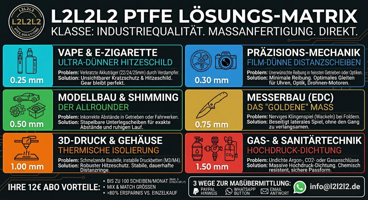 0,25 mm | Der unsichtbare SchutzschildProblem: Kratzer auf teuren Akkuträgern (Vape) durch aufgeschraubte Verdampfer.Lösung: Ultra-dünner Hitzeschild. Schützt den Lack, isoliert die Hitze und bleibt nahezu unsichtbar (passend für 22/24/26mm).